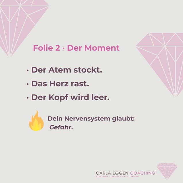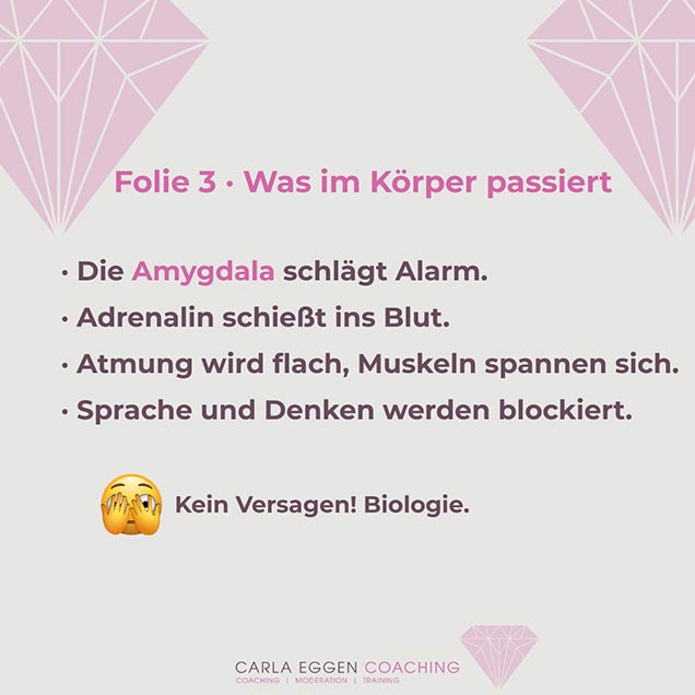 Auch wenn jemand in meinem Präsentationstraining zögert – oder im realen Meeting, bei einem Vortrag oder einer Rede, die er halten soll – wenn Unsicherheit oder Peinlichkeit spürbar werden, läuft im Körper dieselbe neurobiologische Dynamik ab.